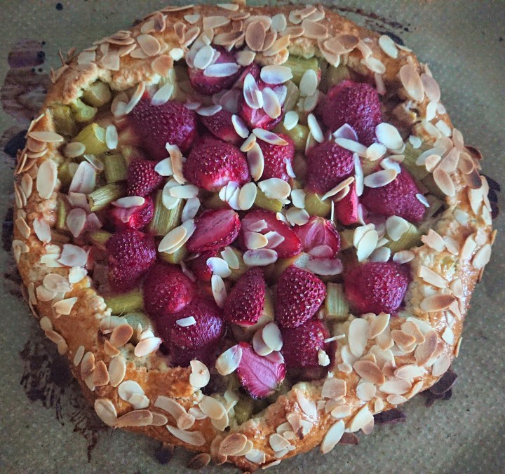 Mod de preparare: Se pune untul rece cubulețe, zahărul și făina în mixer și se mixează la viteză mică circa 1 minută, apoi se adaugă oul și se mai mixeaza încă o minută. După aceata se răstoarna aluatul pe masă și se mai frământă încă puțin. Aluatul se pune pentru cel puțin 30 minute în frigider. Se scoate din frigider și se face o turtă cu diamentul de aproximativ 40 cm. Se pune umplutura în centru, se lasă vreo 5 cm la margini. Marginele turtei se ridică și se acoperă puțin umplutura. Se ung apoi marginile tartei cu gălbenuș de ou și se decorează cu fulgi de migdale sau zahăr brun. Tarta se dă la cuptorul preîncălzit la 180 grade pentru 35-40 minute sau până este gata.