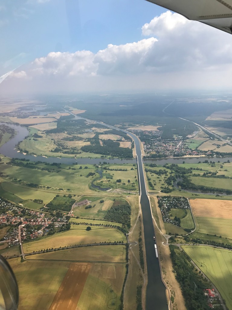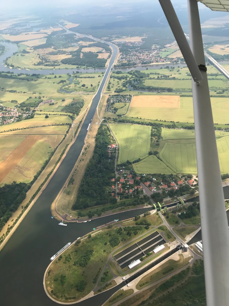 Un loc mai puțin cunoscut, dar care este un proiect unic în regiune este Wasserstrassekreuz (trad. Intersecția străzii de apă). Este de fapt o stradă de apă la intersecția dintre Canalul Mittelland și râul Elba. Pe lângă faptul că reprezintă o importantă structură în rețeteua de căi navigabile din regiune, este și o priveliște minunată. Acolo se poate ajunge cu mașina, bicicleta, un tur cu barca – recomand sau dacă ai foarte mult noroc ca mine poți admira priveliștea de sus, din avion. 🙂